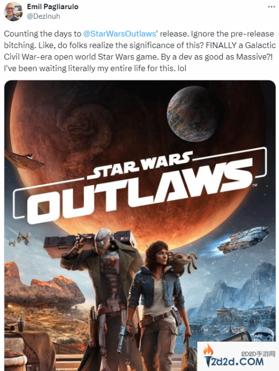 “《星球大战:亡命之徒》已经进入倒计时,忽略发售的抱怨。人们意识到什么事要发生了吗?银河内战时代的《星球大战》开放世界游戏终于要问世了,而且还是出自Massive这样优秀的开发商之手!我这辈子都在等待这一时刻。”