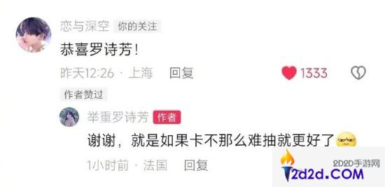 8月9日,罗诗芳在社交平台分享了一段自己获得冠军的视频,3D恋爱手游《恋与深空》官方在评论区里对罗诗芳表达了祝贺,罗诗芳也回应道:“谢谢,就是如果卡不那么难抽就更好了。”除此之外,罗诗芳还发布了一张照片,表示脸都是按照自己样子捏的。
