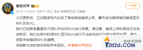 《魔兽世界》出现商城等BUG 官方发文致歉