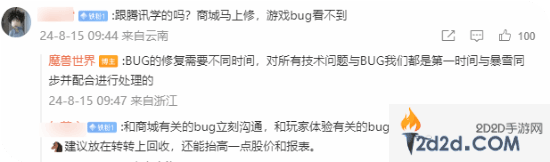 对此,有玩家吐槽:跟商城相关的BUG迅速处理,游戏内容的BUG就置之不顾了;官方则解释称:BUG的修复需要不同时间,对所有技术问题与BUG我们都是第一时间与暴雪同步并配合进行处理的。