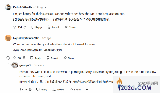 此外,还有人对西方游戏业界的态度表示质疑,担心即使《黑神话:悟空》获奖,西方游戏界可能会忽视其重要性,或出现不公正的对待:“即使他们赢了,我也能看到西方游戏业界‘巧妙地’忘记邀请他们参加颁奖典礼,或者搞一些其他的小动作。”