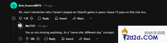 日前,有玩家吐槽了D加密的决策,称“育碧可能是太自信了,以为有人会愿意玩盗版”。与此同时,也有人表示育碧与玩家群体之间欠缺沟通,不知道玩家真正想要的是什么,有人对此感慨道:“我现在才意识到已经好几年没玩过育碧的游戏了。我想我也会放弃《AC影》”,对此,有玩家调侃称“实际上你没有错过任何新作品,因为育碧的游戏都是一样的——空旷的开放世界塞满了支线任务和重复内容。”