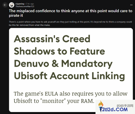 玩家吐槽《刺客信条影》D加密:怕是都没人玩盗版