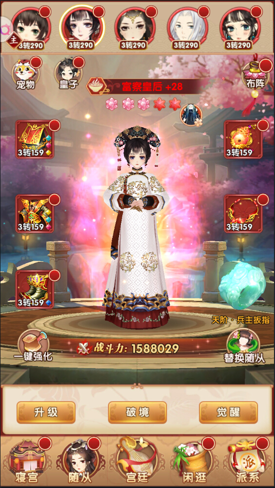 富察皇后坚韧不拔,如落红化泥护花,开局便为己方全体添加三层花瓣筑起堡垒。当随从受到大于生命上限10%的伤害时,花瓣凋零一层并抵挡30%的伤害;当花瓣全部凋落时,会为其恢复皇后生命最大值12%的气血,突破+4时解锁。