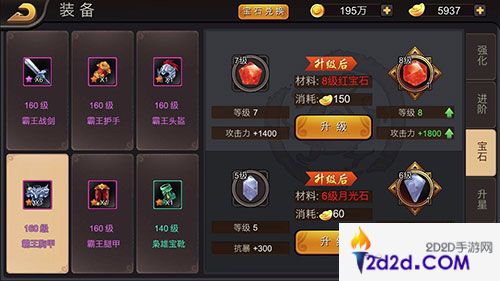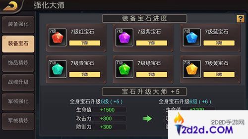 不同种类的宝石分别加成了不同种类的属性:红宝石加攻击力、蓝宝石加防御力、绿宝石加生命值、青宝石加命中、黄宝石加暴击,金刚石加绝对伤害、月光石加抗爆、紫宝石加闪避、黑耀石加伤害免疫。随着宝石的升级,所加属性也逐渐变多。4级宝石以下升级消耗金币,4级以上消耗元宝。此外,游戏内还有宝石强化大师系统,即宝石升级一轮,便获得一级宝石升级大师,增加生命值,攻击力和防御力。