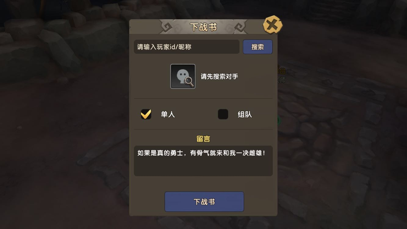 不同擂台的是,在生死擂台中,挑战者需要消耗钻石购买道具来向指定ID玩家下战书。通过组队或单人进行。