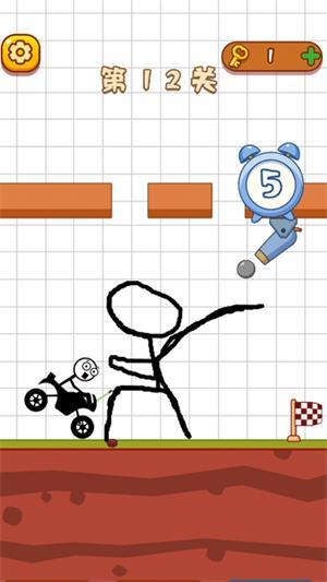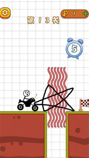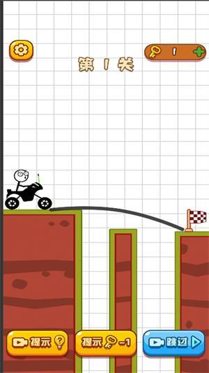 这关太费脑是一款休闲趣味的解谜闯关类手游,游戏中有各种各样的挑战等待玩家去完成,游戏的画面虽然是卡通的风格但却十分精致。游戏的玩法很简单,玩家需要画线帮助一个驾驶着摩托车的火柴人通过地面的裂隙并且在规定的时间内到达终点,玩家需要开动脑筋用最快的方法帮助火柴人。