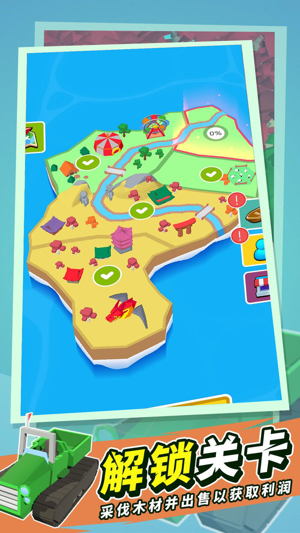 2、关卡设计多元化,包含不同的森林面积和任务类型,风格还原真实的伐木场景。