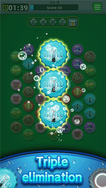 1、创新的瓶盖搭配,独特的消除方式,精彩的三消体验。