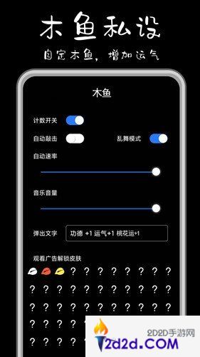 2、丰富多样的木鱼设计:丰富多样的木鱼设计,每条木鱼都有不同的外观和声音。 玩家可以根据自己的喜好选择不同的木鱼,享受不同的敲击体验。