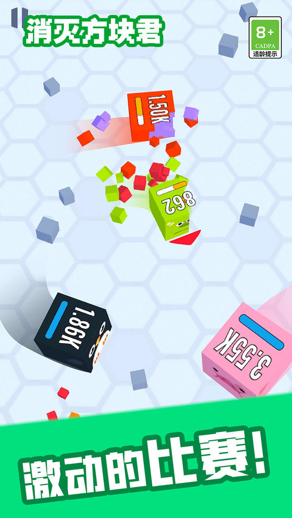 《消灭方块君》是一款融合了方块和贪吃蛇竞技玩法的益智小游戏。 游戏中,玩家将操作一个可爱的小方块,在一个3D竞技场中和其它方块比拼。 游戏的规则简单而有趣,不断收集较小的方块,从而变大,同时也要注意躲避比你大的方块来袭。 击败对手可以获得金币奖励,一定数量的金币可以解锁有趣而时髦的皮肤,快来立即下载,您一定会玩得很开心!