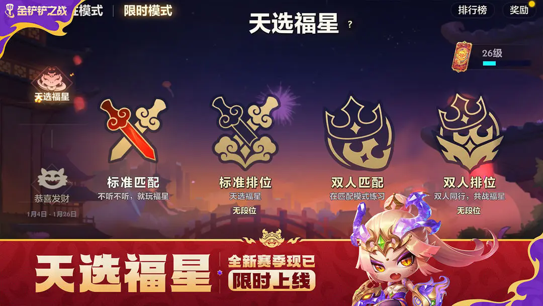 参与福星临门活动,感受全新棋子、羁绊和机制带来的体验!弈士们既可以参加标准模式,和朋友们组队开黑,自由体验天选福星的弈子和玩法;也可以选择更加刺激的集福模式,和各地玩家一起进行竞技排名,冲榜获得活动专属的丰厚奖励~