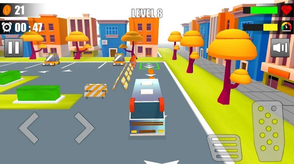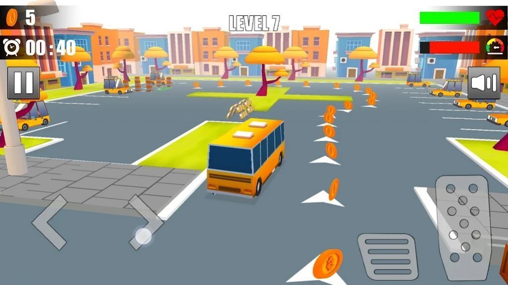 1、游戏中,玩家需要控制公交车,综合考虑交通规则、人行道等因素,将公交车安全、准确地停放在指定位置。