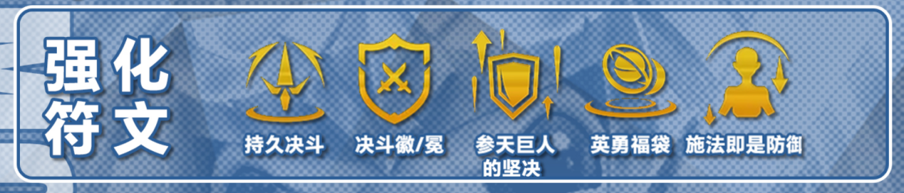 符文方面比较推荐:持久决斗、决斗徽/冕、参天巨人的坚决、英勇福袋、施法即是防御。