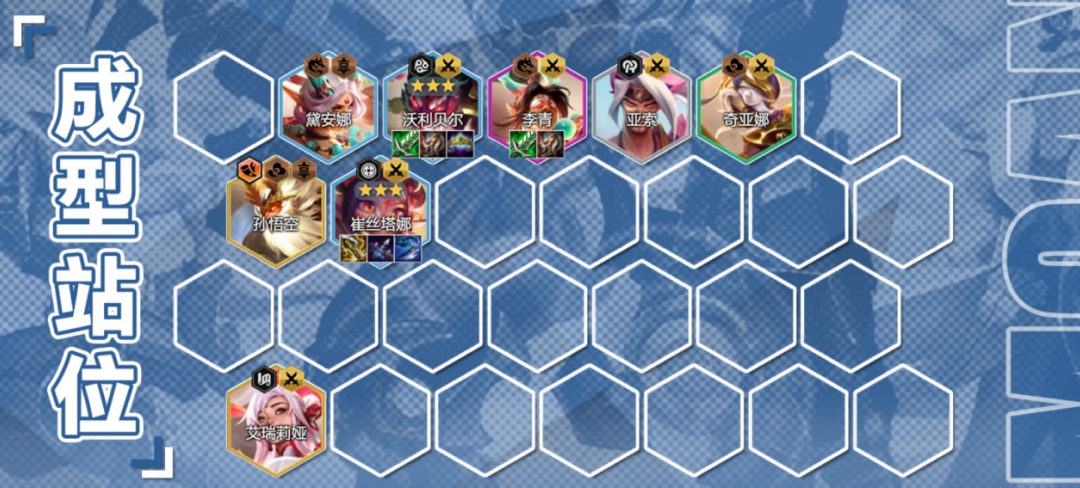 阵容是双c位阵容,后排输出主C崔丝塔娜(小炮),前排C是沃利贝尔(狗熊),两者都是3费卡可一起追3星。