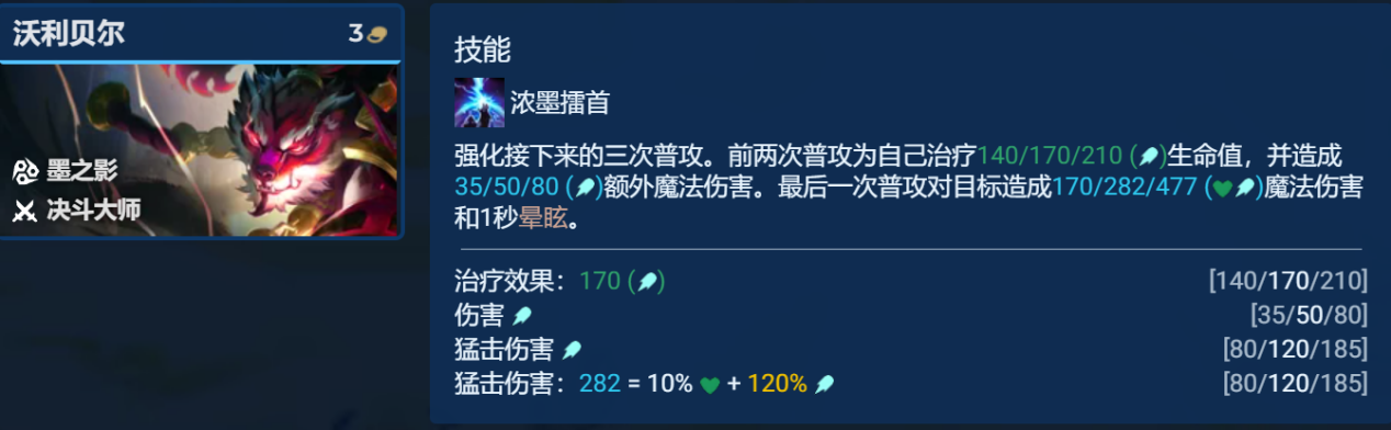 前排c沃利贝尔是纯普攻型棋子,开启技能后每三次普攻的前两次都能给自身治疗是高额生命值,在决斗羁绊攻速叠加起来后,50法力值技能释放频繁,生存能力特别优质,而其释放技能后每第3次普攻会造成高额魔法伤害,关键还有1秒控制,3星后搭配半坦装或肉装坦度与输出均会非常优质。