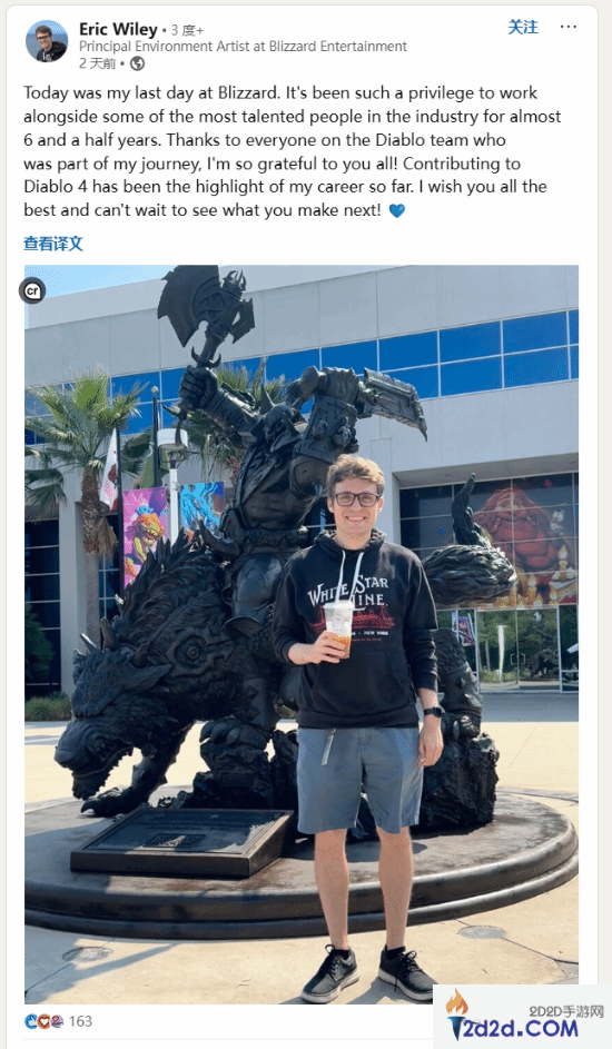在发表在linkedin动态中的离职声明中,Eric Wiley表示:“今天是我在暴雪的最后一天。能与业内一些最有才华的人一起工作近 6 年半,我感到非常荣幸。感谢《暗黑破坏神》团队中的每一个人,他们参与了我的旅程,我非常感谢你们!到目前为止,为《暗黑破坏神4》做出贡献是我职业生涯的亮点。我祝你们一切顺利,迫不及待地想看看你们接下来会做什么!”
