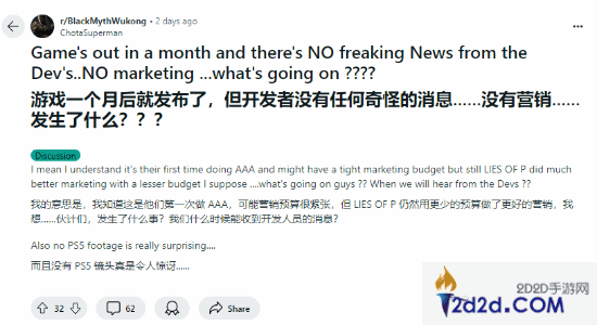 还有一个月,《黑神话:悟空》就要正式发售了,但游戏在国外的宣发并不算多。这段时间,已有国外网友在reddit论坛发文,吐槽该作在国外的宣发太少。