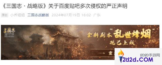 《三国志战略版》谴责百度贴吧侵权:停止不法行为!