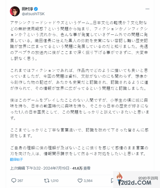日本知名搞笑艺人田村淳近日在推特发文,称自己已经注意到了《刺客信条:影》的相关问题,并将采取适当行动。