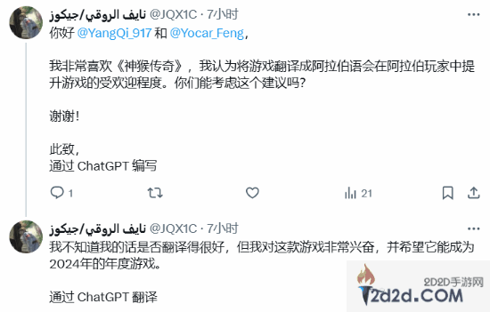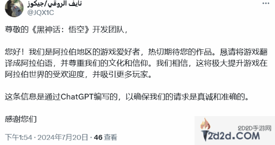 为了表达诚意,玩家表示他是通过ChatGPT进行的编写,以确保翻译的真诚和准确性。