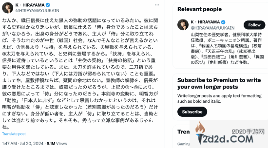 平山悠曾撰写过多本有关战国时期的书籍,他在推特发长文,分享了对此事的看法。平山表示,尽管关于弥助的历史文献不多,但“毫无疑问”他是一名侍奉信长的武士。