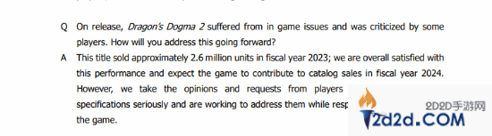 有股东在大会上提问道:“《龙之信条2》在发售时遇到了一些游戏问题,并且受到了玩家们的批评。你们今后将如何解决这个问题?”