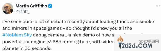 Griffiths表示,“我最近看到了很多关于太空游戏中加载时间和其他有的没的,所以我想向大家展示一下《无人深空》调试镜头,很好地展示了我们引擎是多么的无缝和强大!这是在PS5上运行的,用iPhone录制的,50秒内在3颗行星间(无缝穿越)。”