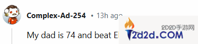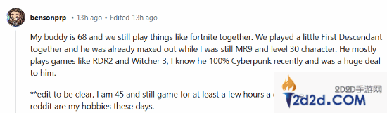 “我的朋友已经68岁了,我们仍然一起玩《堡垒之夜》这类的游戏。我们一起玩了《第一后裔》,当我还30级他都已经满级了。他主要玩《大表哥2》和《巫师3》,我知道他最近刚白金了《赛博朋克2077》,对他来说也是个不小的工程。”“顺带一提,我也已经45岁了,每天仍然坚持至少玩几个小时,我很喜欢在reddit和大家讨论。”