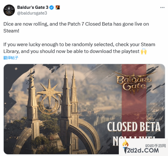 近日拉瑞安发推宣布,《博德之门3》7号补丁封测版已在Steam上线,但目前该补丁只面向被随机邀请的玩家。拉瑞安表示:“如果您足够幸运地被随机选中,请检查您的Steam库,现在您就可以下载并进行测试了。”
