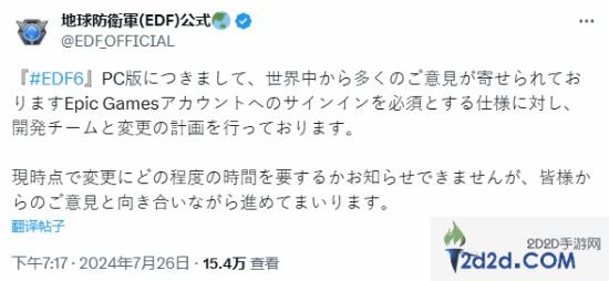 7月26日晚,《地球防卫军6》官方表示其已经收到了来自世界各地玩家的大量反馈,并表示正与开发团队合作解决强制要求玩家关联Epic账号的问题,但目前尚不清楚需要多长时间解决。截止发稿前,《地球防卫军6》的Steam评价已经升至“褒贬不一”。