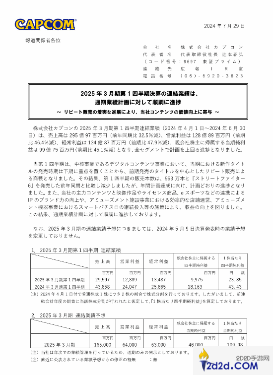 7月29日,卡普空正式公开了24-25财年Q1(4月~6月)财报。财报显示,该季度销售额为295.97亿日元,同比减少32.5%,营业利润则为128.89亿日元,同比减少46.4%。