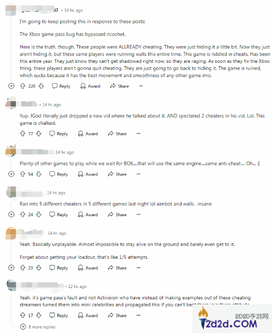 Reddit上有用户发帖称,他在连续几场游戏中遇到了多名作弊者,并指出自瞄和透视非常普遍。另一位用户则直言这游戏已经没法玩了,存活和找回装备的难度上升了一大截。还有用户批评动视不作为,并表示这些问题即使在《使命召唤21》推出后也无法改变。