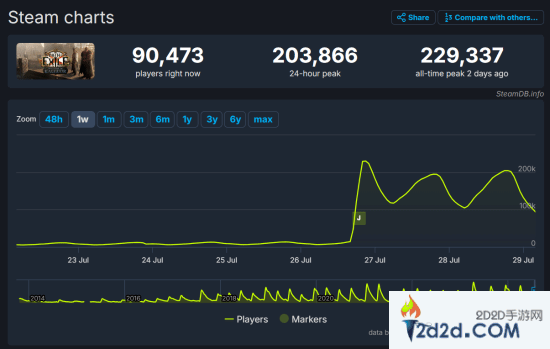 《流放之路》的3.25更新“Settlers of Kalguur”已于近日上线,据统计网站SteamDB发布的数据显示,目前《流放之路》Steam版的同时在线人数破新高,达到了229337人,24小时峰值人数为203866人。