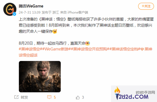 官方写道:“上次准备的《黑神话:悟空》壁纸海报收获了许多小伙伴的喜爱,大家的热情蛋蛋君已经感受到啦!8月即将到来,本次我们制作了黑神话主题日历壁纸,欢迎感兴趣的天命人一键保存。8月20日,期待一起放马西行,直面天命。”