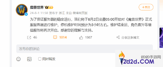 面对这种情况,官方今日发文称:“为了保证服务器的稳定运行,我们将于8月2日凌晨05:00开始对《魔兽世界》正式服服务器进行维护,停机维护时间预计为3小时左右。维护结束后,角色直升等增值服务将再次开启。感谢您的理解与支持。”