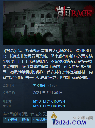 日前,国产全动态音像真人恐怖游戏《背后》在Steam提前发售,截止发稿,本作共收录了179篇玩家评测,好评率88%(特别好评)。