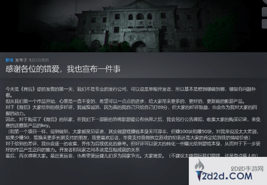 为了感谢玩家们的支持,开发团队宣布“对于购买了《背后》的玩家,在我们下一部新的恐怖影游能公布信息之后,我会另行公告通知,收集大家的购买记录,来免费的送赠新产品的key。”