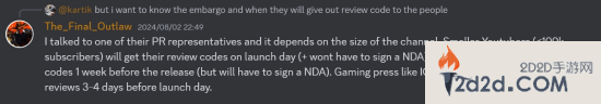 根据The_Final_Outlaw表示,他和官方的公关人员交谈过得知,小型YouTube频道(订阅人数少于10万)将会在游戏发售当天收到评测代码,这些创作者不需要签署保密协议(NDA)。这意味着,他们可以在第一时间分享他们的游戏体验和评测,直接影响游戏首发时的市场反馈。