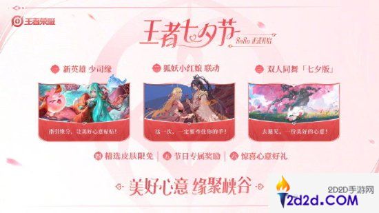 王者七夕节即将开启,全新内容包括【新英雄少司缘】即将降临王者峡谷;【狐妖小红娘联动】即将开启,一起见证红红月初的相聚峡谷;【七夕版双人同舞】玩法来袭。