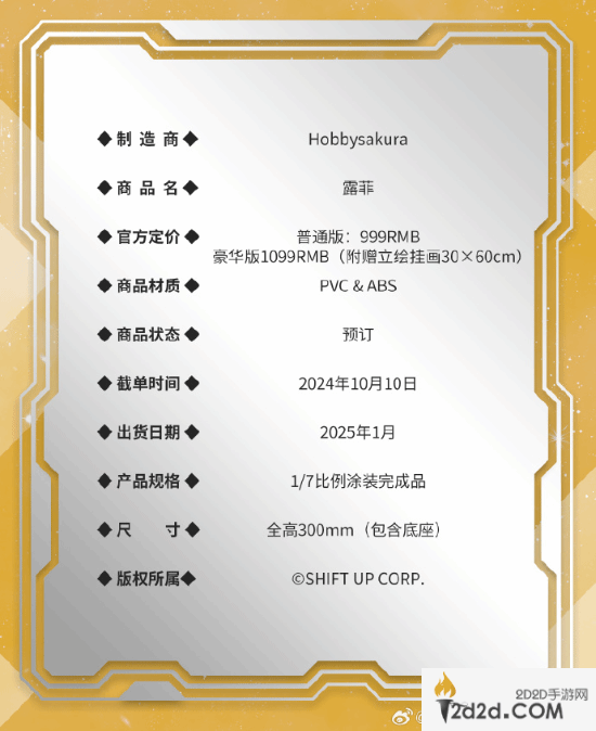 良笑社上架《NIKKE:胜利女神》露菲1/7比例手办,普通版售价999元,豪华版售价1099元(附赠立绘挂画30*60cm )。预订已开启,2025年1月出货。一起来欣赏一下。