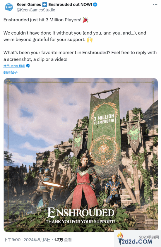 开发商Keen Games GmbH近日正式宣布,合作类生存动作RPG《雾锁王国》的玩家人数已经突破300万人,官方还发布了一张贺图庆祝,表示如果没有玩家们的支持,游戏就不可能做到这一点,并对所有玩家的支持表示感谢。