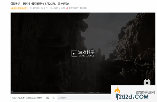 《黑神话:悟空》最终预告已于8月8日发布,B站播放量仅用4天时间就突破千万大关,来到1028.5万次播放,在文章发布时仍有4000+的玩家正在看。