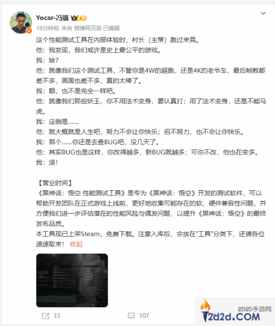本作主创团队成员冯骥今日谈及该测试工具,称在内部测验时,游戏展现了无与伦比的出色优化: