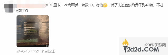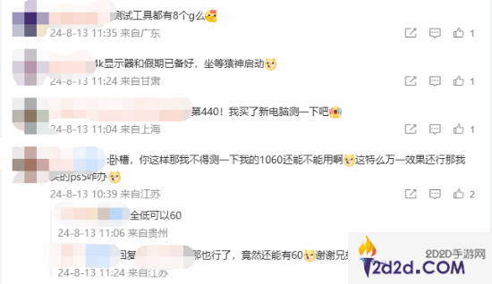 在评论区里,众多玩家根据自己机器的配置纷纷进行了测试,有玩家表示使用RTX 3070显卡在2K分辨率的高画质设置下,平均帧率能够达到80帧,开启光追后帧数降低至40帧。还有玩家用GTX 1660Ti显卡以中画质进行了测试,结果显示平均帧率能达到64帧。还有玩家已经迫不及待,表示:“好好好!游戏还玩不到!先玩玩跑分工具解解馋。”