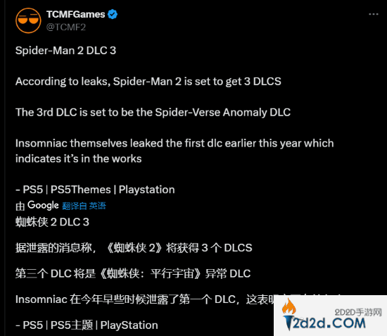 知名爆料人@TCMFGames近日在推特表示,失眠组(Insomniac Games)旗下《漫威蜘蛛侠2》将获得3个DLC,并且第三个DLC将与《蜘蛛侠:平行宇宙》相关。