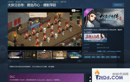 由半瓶醋工作室制作的武侠题材游戏《大侠立志传:碧血丹心》DLC“倩影萍踪”现已正式发售,售价18元。