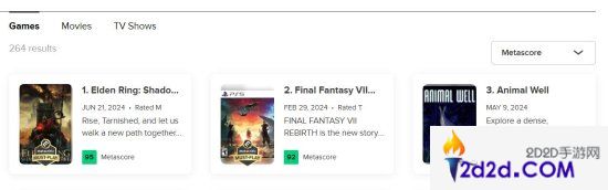 此外,在2024游戏评分榜单占据前三位置的游戏分别是《艾尔登法环:黄金树之影》(95分)、《最终幻想7:重生》(92分)和动作类冒险游戏《动物井》(91分)。