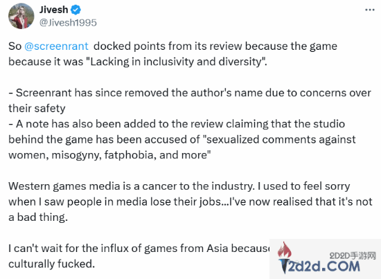 国外网友@Jivesh调侃道:“西方的游戏媒体对这个行业来说就像是一种毒瘤。以前我看到媒体从业者失去工作时,我会感到同情……但现在我意识到这并不是一件坏事。我迫不及待地等着来自亚洲的游戏大军涌入,因为西方的文化已经烂透了。”