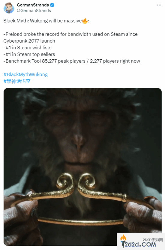 国外游戏资讯推主@GermanStrands今日发文盛赞《黑神话:悟空》:《黑神话》太厉害了!预载打破了自《赛博朋克2077》发布以来Steam上的带宽使用纪录,Steam愿望单排名第一,Steam畅销榜排名第一,测试工具在线峰值多达8.5万人。